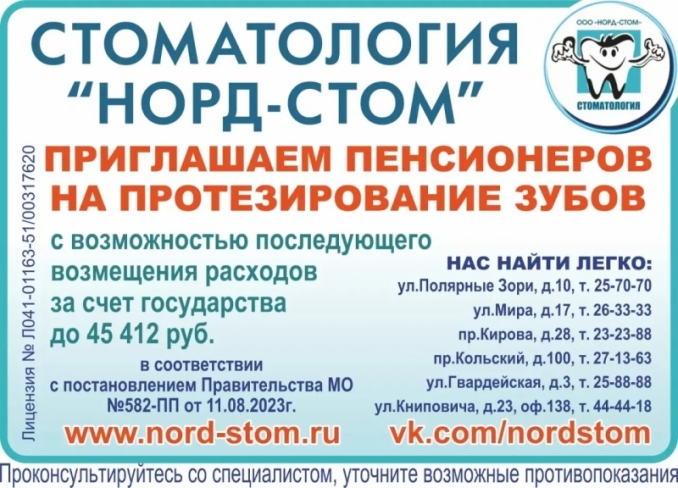 ООО “НОРД-СТОМ” – это частная стоматология, которая осуществляет свою деятельность с 1994 года и имеет целую сеть клиник, расположенных в разных районах Мурманска. Большой врачебный опыт, новейшее оборудование и качественные материалы позволяют осуществлять лечение и протезирование на высоком уровне.